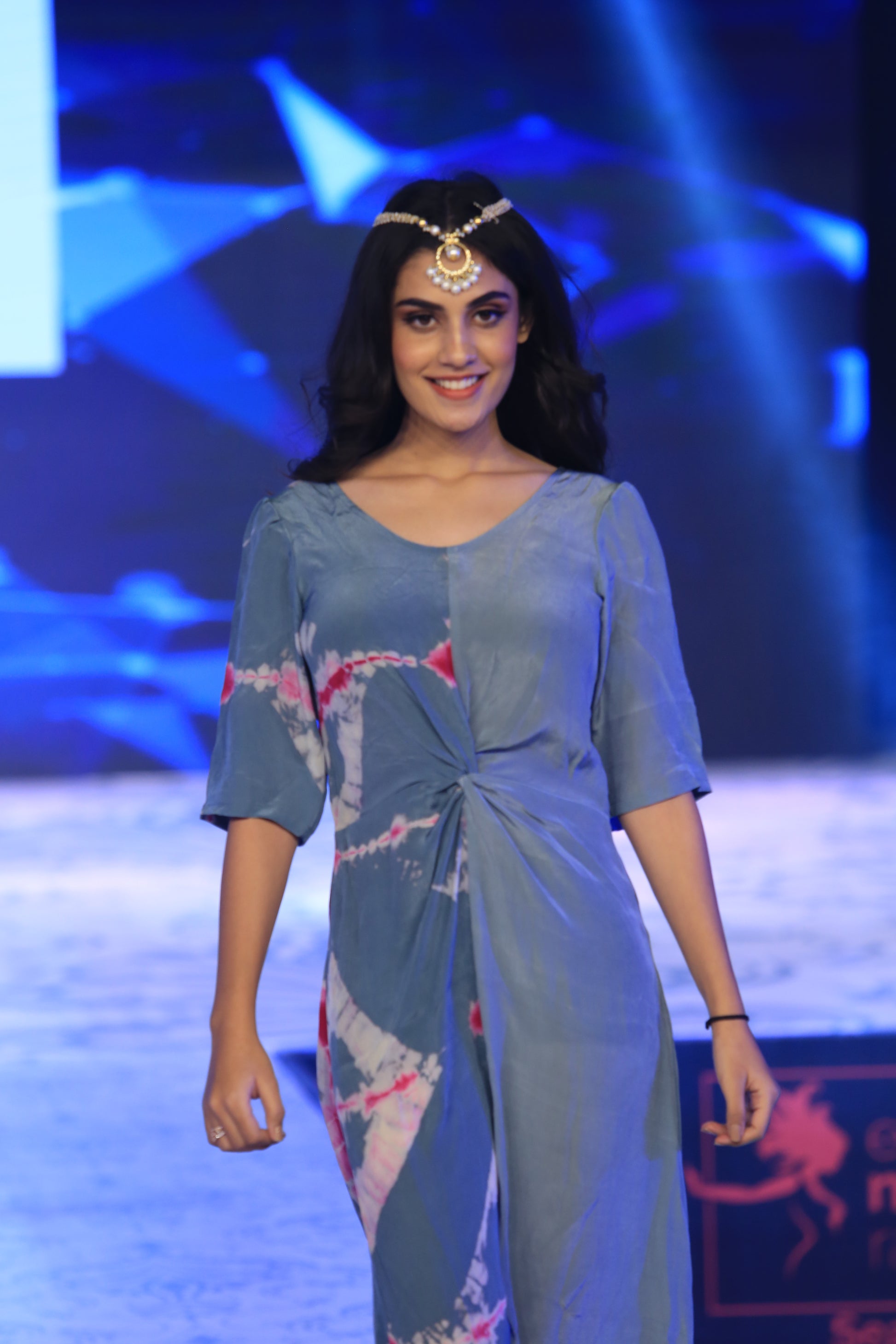 Twisted waist, symmetric structure and half shibori half solid, this gown entails elegance and ease.